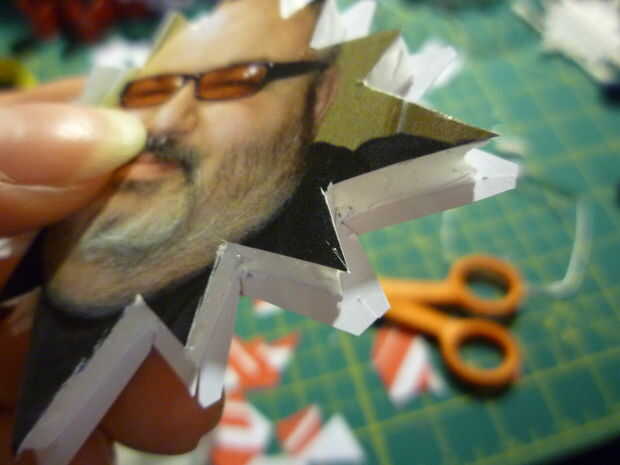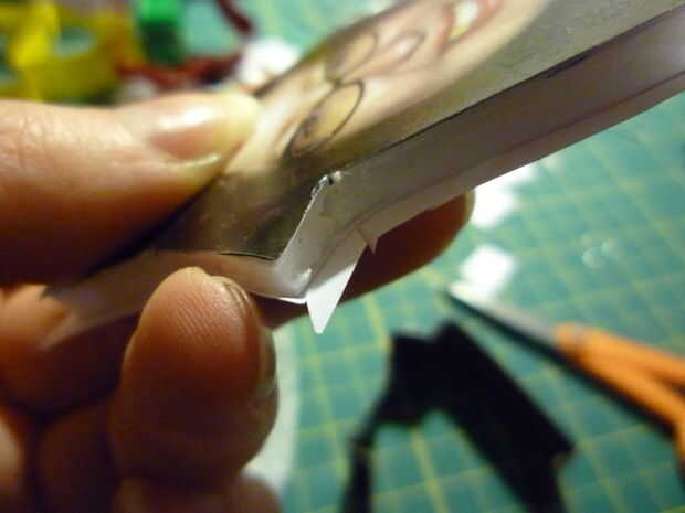 Recortar el papel, pero deja un poco extra sobresale, aproximadamente 2/3 del espesor de la placa. No tiene que ser perfecto. La razón que dejé este trabajo extra fue de "envolver" el borde del tablero y brechas poco tenía. Yo usando a una tela estampada para conseguir mejor "envolver", y no veo por qué tela no iba a funcionar muy bien. Porque el papel no super flexible, puse poco cortes en todos los puntos de deformación (esquinas y curvas, donde el papel podría rasgarse cuando inserta el cortador de la galleta).