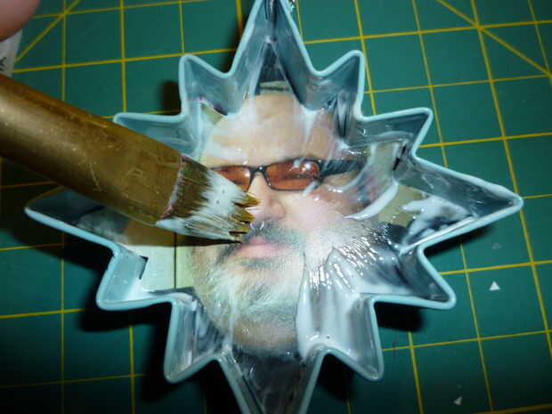 Use un cepillo y algunos Modge Podge para rellenar los bordes entre la Junta y el cortador de la galleta. También, pintar el pegamento sobre la imagen para proteger y sellar todo. Deje que se seque completamente.