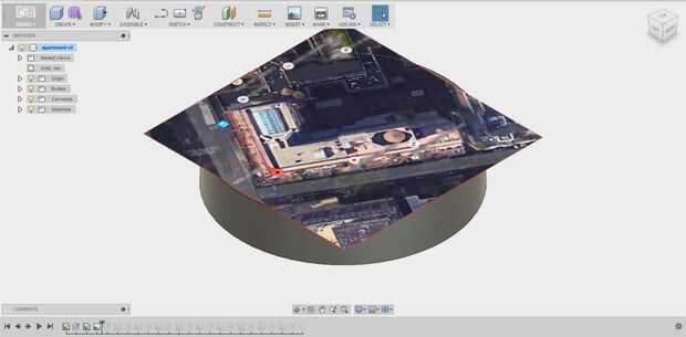 Ahora, es el momento para agregar la imagen que encontró en el modelo. La mayoría de programas CAD permite colocar imágenes en bocetos, pues crear un boceto en la parte superior del cilindro y colocar la imagen en la superficie. En Autodesk fusión 360, puede seleccionar "Insertar" y seleccione "Lienzo atado" para insertar y escalar la fotografía seleccionada. Escala y mover para que todo el edificio se ajusta dentro de la base que creaste.