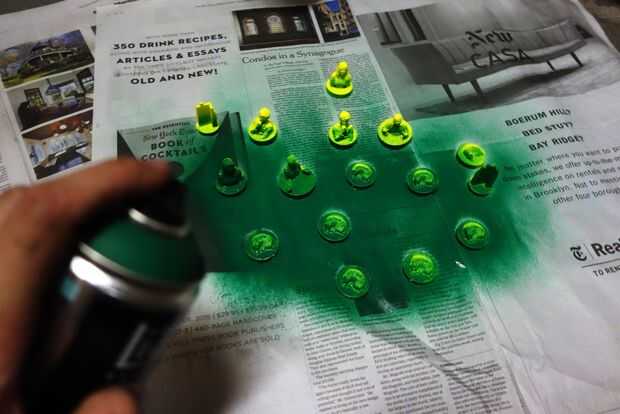 No tenía mucha opción de color para seleccionar el filamento de la impresora, así que decidí imprimir todas las piezas en un solo color y pintar después. Usé el mismo pinturas para pintar el tablero de ajedrez que tenía un esquema de colores coherente. Piezas impresas 3D son porosas, que tal vez necesite darles unos abrigos para mostrar fuerte de la pintura. Todos los detalles hubiera sido difíciles para mí con un pincel fino, así que decidí spraypaint mis partes. Si desea agregar detalles con un pincel fino, podría utilizar unos colores diferentes para resaltar ciertas características (pelo, piel, rasgos faciales, etc.) y posiblemente hacer que cada juego tiene un diferentes trajes de color base o diferentes: el trabajo de pintura depende de usted! Retiradas todas las piezas y déjelas secar.