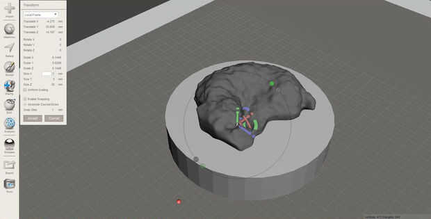 Luego es hora de añadir una base para el modelo 3D para que se vea un poco más-pieza de ajedrez como. Para ello, haga clic en la barra de herramientas de "Meshmix" y desplácese hacia abajo hasta que encuentre un cilindro. A continuación puede arrastrar el cilindro en su modelo. Utilizando la herramienta de transformación en "Editar", puede ajustar las dimensiones de la base de la botella a tu gusto. Asegúrese de que usted desmarque "Escala uniforme" antes de hacer esto, para que puedan tomar la altura del cilindro diferentes del diámetro. El tablero de ajedrez que hice (que hablaré más adelante), llegó a tener 1.5" damas cuadrado, por lo que todas las piezas a ser menor tamaño de esa dimensión. Según el software de escaneado 3D que utiliza, puede que necesite ampliar o reducir el modelo para que quepa en la base. Utilice la herramienta de transformación con el modelo de escaneado seleccionado para mover, rotar y escalar la pieza hasta que encaje en la base. Asegúrese de que existe cierta superposición entre la base y el modelo de escaneado, a combinarlos en el paso siguiente. Aquí estaban las dimensiones base que fui con (Meshmixer utiliza unidades métricas, así que hice las conversiones):