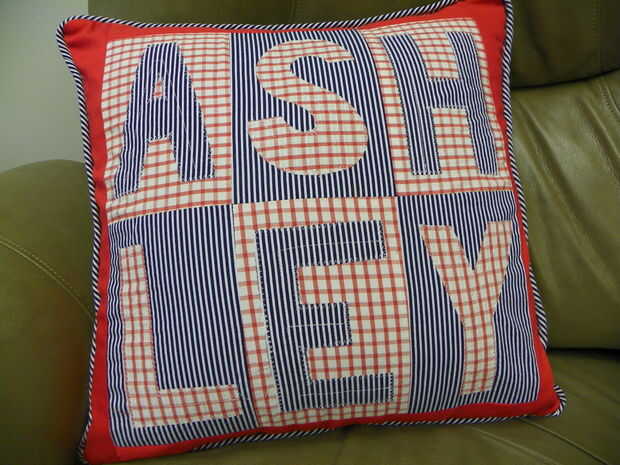 hice esta almohada de 3 camisas viejas que encontré en la tienda de segunda mano. Tenía una almohada vieja que utilizaba el relleno de. Quise personalizarla así que midió la almohada vieja y calcularon qué tan grande sería cada letra. Esto también podría trabajar para un nombre con letras de 4 o 5 si reorganizan. Creo que la tubería y la estructura de borde rojo las letras muy bien.