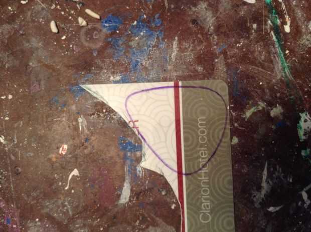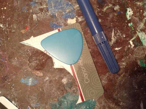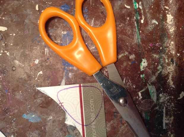 Trace su guitarra Guitarra o pick pick plantilla a la antigua tarjeta de crédito (o cualquier plástico tiene) uso de marcador. Luego use sus tijeras para recortarlo. Utilice un cuchillo o tijeras para suavizar los bordes.