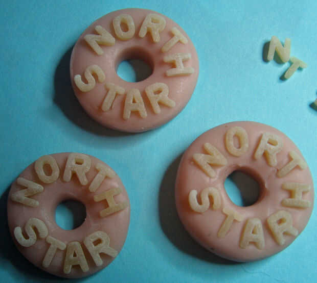 7. Coloque con cuidado sus cartas en un círculo en la parte superior sus salvavidas en blanco. Utilice una superficie plana (cuchillo de mantequilla, arte pega etc.) empujar suavemente a cartas a la arcilla del polímero. Prensa cartas sobre a medio camino en la arcilla. Dependiendo del número de tamaño de letras y los dulces, puede que necesite hacer letras más cerca al borde del círculo para conseguir que se ajuste. Seguir trabajando hasta que estés satisfecho con el aspecto de su maestro. Arcilla suave alrededor de la base de las letras.