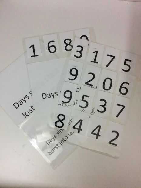 Imprimir sus dígitos y sus frases, os adjunto mis números y una frase de ejemplo. Si haces tus propias frases hacer que usted deje la mitad de la mitad de la página en blanco y escriba su frase sobre la otra mitad de la página media apenas como en el archivo de ejemplo. Corte sus cifras y frases dejando asignan de página en blanco por encima de ellos pero no tanto fuelle. Meter en bolsas dejando espacio entre ellas de laminación y luego recorto.