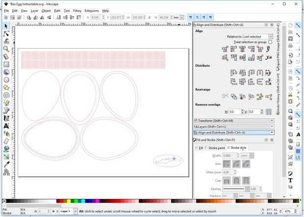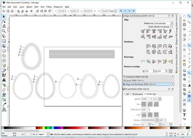 Para este paso usted va a tener algunas copias de la forma original, puedes hacerlo con el método tradicional de "copiar y pegar" y después realigning las formas recién creadas pero Inkscape también tiene una función de duplicado ("Editar -> duplicado" o "Ctrl-D") que es muy útil aquí. Duplicar crea una copia de la original en la misma posición que el original. En el modo de contorno puede ver cuando hay varios objetos porque las líneas aparecen más oscuras.
