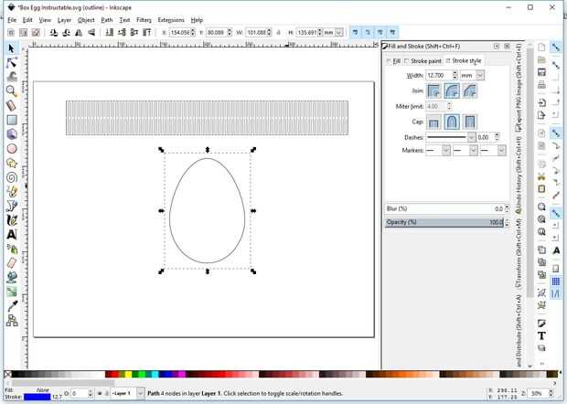 Seleccione la primera forma y cambiar el ancho de trazo para el espesor del material. En nuestro ejemplo utilizamos 2,7 mm madera contrachapada del álamo, disponible de Kitronik, por lo que establecemos el grosor del trazo para que coincida con el material. Seleccionar la segunda forma y establecer el ancho de trazo 10mm + el espesor del material, en nuestro caso 12.7 milímetros. Esto creará un labio en la parte superior de la caja es de 5 mm de espesor, si quieres un labio más grueso no olvides doble este valor en el cálculo de la anchura del trazo. El contorno de puntos de la forma será más grande que la forma pero la forma de la misma aparecerán debido a modo de esquema no muestra el grosor de la línea.