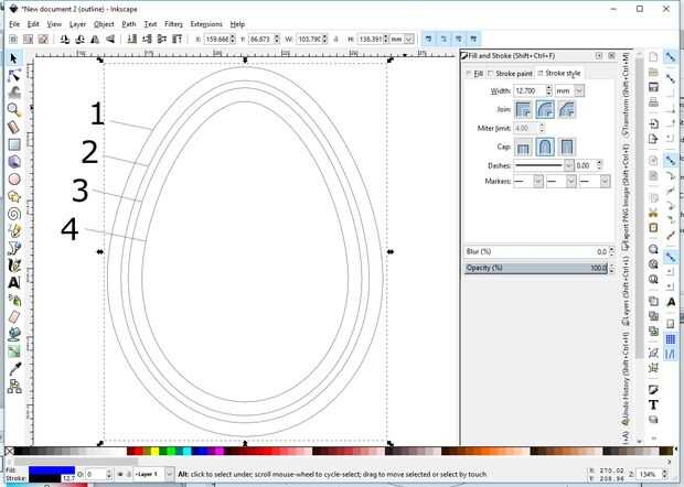 Para crear los contornos adecuados que es necesario convertir el trazo en trazados este tiempo. "Camino -> golpe al camino" va a crear 2 líneas para cada forma, en el interior y en el exterior. Estas necesidad de dividirse otra vez para hacer 4 líneas separadas "Ruta -> Break Apart" le dará 4 anillos concéntricos. Hemos marcado con 1-4 en el diagrama.