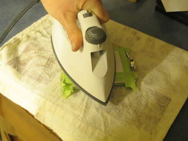 Tratar de no superponer la cinta y la imagen. Coloque la tela como una camiseta sobre el frasco e imagen y hierro con una presión firme durante 2 minutos, a temperatura alta de hierro. La tela es muy importante para la igualación de presión y calor, es un paso simple pero se ve muy mal si se salta. No ves a la tela en las fotos porque tomé estas fotos antes de que empezaron a poner a la tela en y era planchar directamente sobre el papel. Los frascos de todos parecían una mierda.