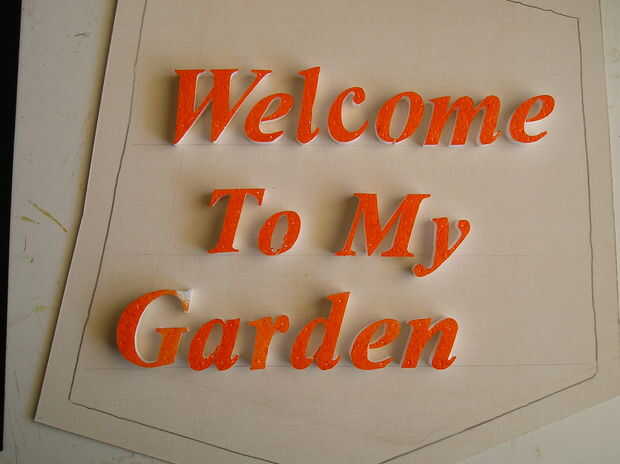Esto toma un poco de práctica, pero no mucho. Las dificultades podrían ser en no ajustar la temperatura correcta en el alambre de corte. Práctica en algunas letras adicionales, y se vuelve muy simple. Aquí es el mensaje "Bienvenido a mi jardín". Es naranja simplemente porque utilizo esta espuma para todo tipo de signos, y antes de pintar algunas piezas si sé qué colores quiero. Obviamente, el color no importa se eliminará con la espuma de poliestireno en el final.