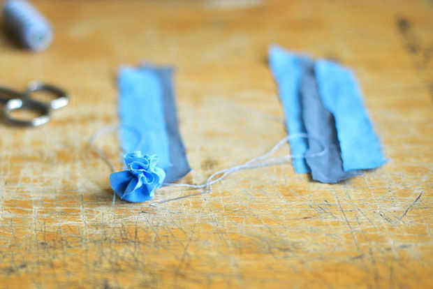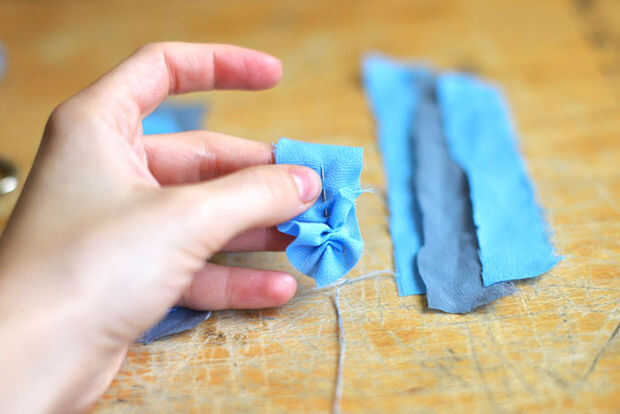 Coser la primera tira. Pase la aguja por el centro de todo en todas partes; Tire del hilo para formar ciertos volantes; Hacer el mismo proceso con otra cinta; Si es necesario, añadir en el tercer o más correas. Al final, nudo para asegurar.