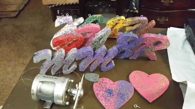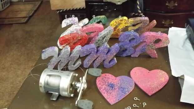 Instale los ojales agujeros diminutos con la Dremel o presionando duro al enroscarla en. Atar en una longitud de línea a la longitud deseada que cuelga de la pesca. Os adjunto un corazón a algunos de los nombres para mostrar una variación. Si utilizas claro 6 prueba de lb o más pequeño, parece invisible en el árbol o donde decides colgarlo.