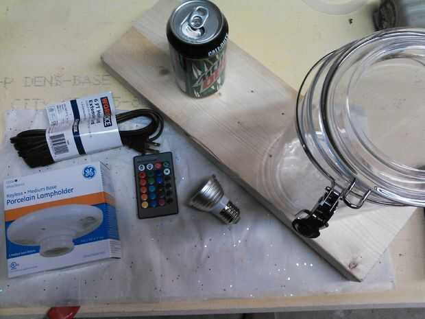 Un 2 x 6 x 8" tablero, un cable de extensión, una bombilla de LED cambia de color (E27) además de un zócalo de cerámica de la pared para la bombilla, un envase de cocina claro cilíndrico sobre 4 pulgadas de diámetro y un pedazo de papel de seda. También recomiendo una fuente alta de cafeína debido a que la información añadido es extenuante.