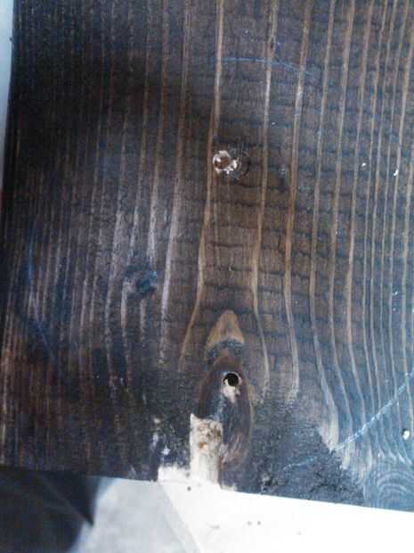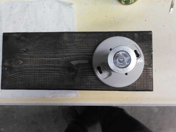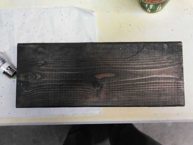 Para comenzar, la arena y su base a preferencia el tinte/pintura. Una vez seco, decidir sobre las colocaciones. Coloque la pieza de cerámica en un lado de la Junta 1/2 una pulgada lejos del borde de 6 pulgadas de lado y marcar los lugares para los tornillos con un golpecito en un clavo en los agujeros. Con una broca pequeña, avellane estos puntos.