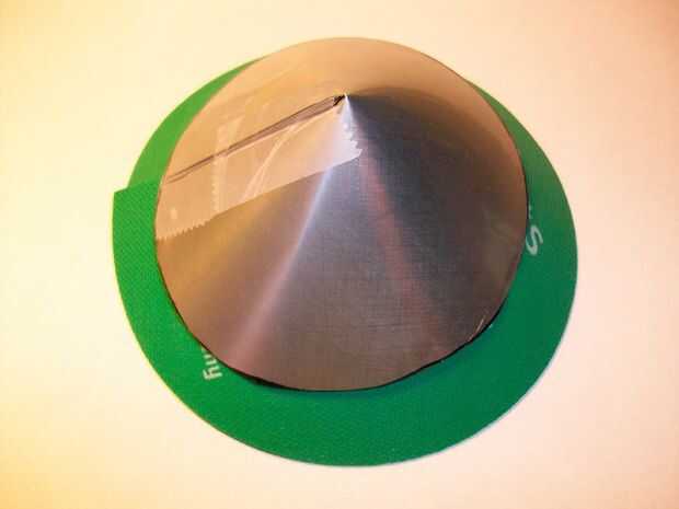 Doblar el metal y el material antideslizante en conos, colapsando el corte de la cuña sobre la cuña a su lado.  Asegurar ambos conos con pequeños trozos de cinta.  Luego, coloque el cono de antideslizante en el cono de metal y usar algun pegamento (cualquier tipo funcionará) para sujetar los dos conos juntos.