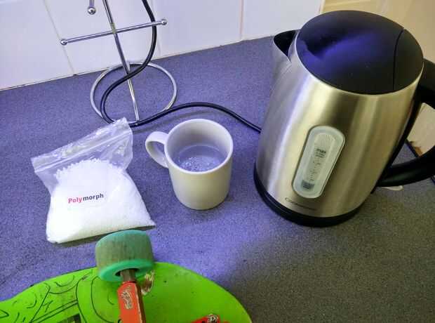 En segundo lugar se necesita una bolsa de gránulos de polimorfo de alta calidad. Polimorfo es un plástico que se derrite en agua caliente. Cuando suave es claro y puede ser esculpido. Una vez se ha enfriado otra vez vuelve a un plástico blanco duro con propiedades mecánicas similar al nylon. Se puede comprar fuera de internet para alrededor de £20 para un kilo, aunque este Instructable sólo requiere varios gramos.