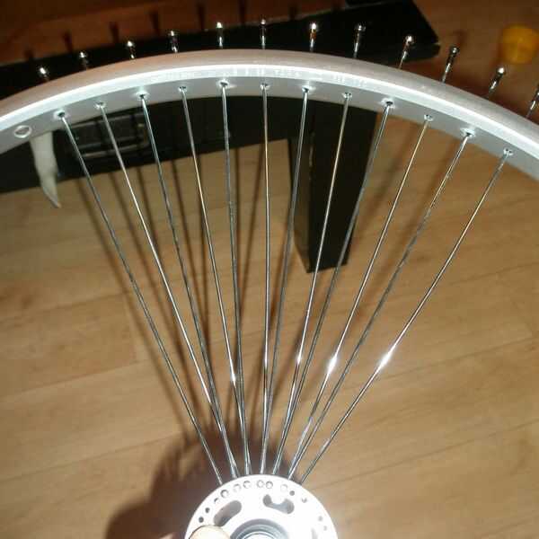 Skip 12 agujeros en el borde y puesta sobre otra vez con el grupo siguiente de 12 radios.
