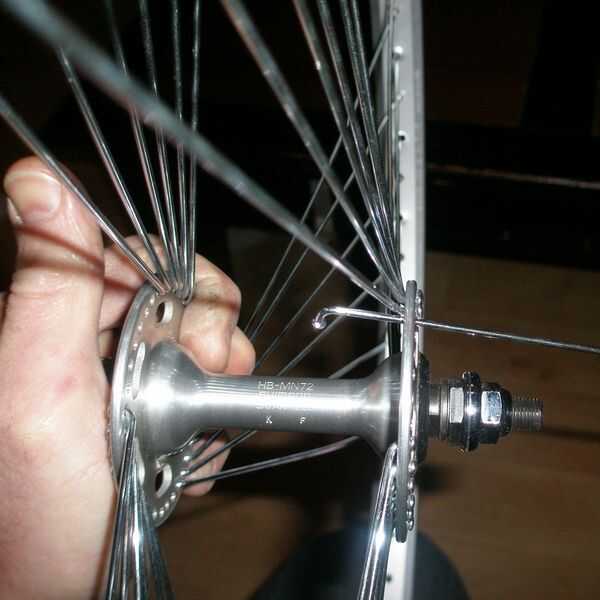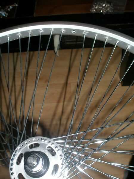 Este rayo se sienta junto al grupo de 6 ya colocado en la rueda, cruzar estos 6 radios e insertar al lado del agujero de la válvula, puso un niple girándola alrededor de 3 veces.