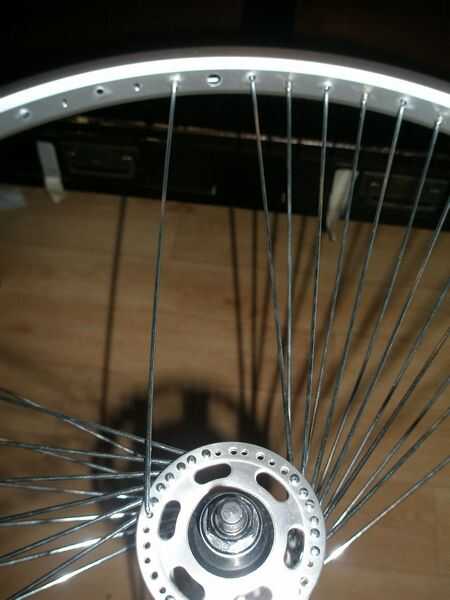 A veces es difícil conseguir el primer pezón, esto es porque los otros pezones de los radios ya dentro de la rueda no han caído lo suficiente en el borde cuando usted da vuelta el cubo haciendo espacio en el agujero de la válvula. (la manera descrita en la página anterior)