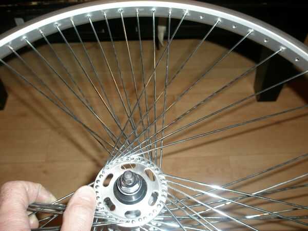 Voltear la rueda e introducir los radios en el lado del cubo donde sólo insertó el anterior habló.