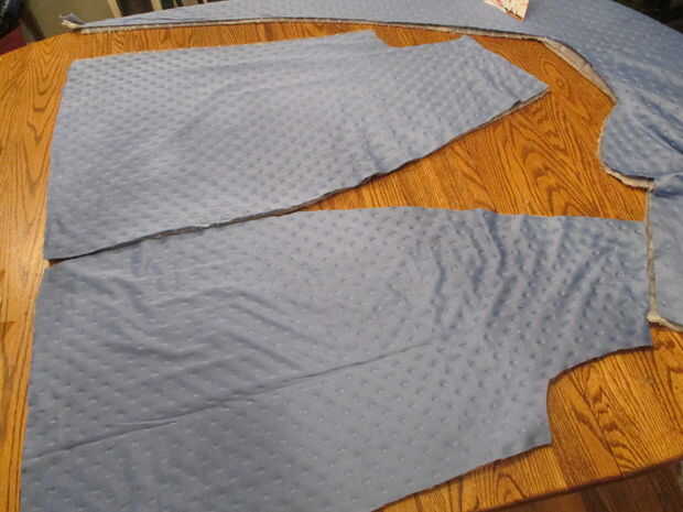 Corté por la mitad, luego quitar el traje, a veces más de lo que a cortar en la tela restante y cortar la otra mitad. Esto es mucho más fácil que trazo alrededor de ambos bordes de la túnica.
