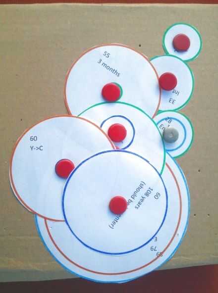 Para poner hacia fuera y averiguar qué va dónde, realmente me recorte un círculo para cada marcha y pasó un día pegando chinchetas a través de ellos en cien diferentes configuraciones.
