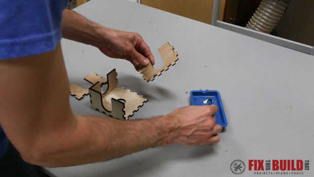 Cuando se hizo el láser he quitado las piezas y montar el soporte de la montaña. Usé pegamento de madera para montar el soporte y gomas para sujetar juntos mientras el pegamento secado