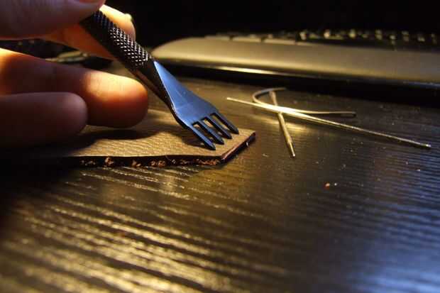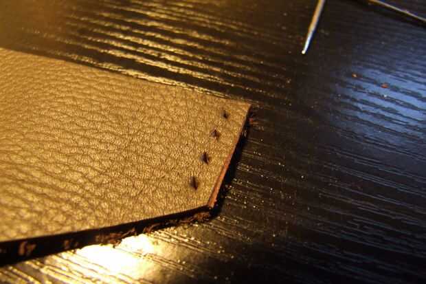 Utilicé un cortador de cuero de forma de diamante, para cortar los agujeros para la costura, pero usted puede usar punzón simple, o incluso un clavo.