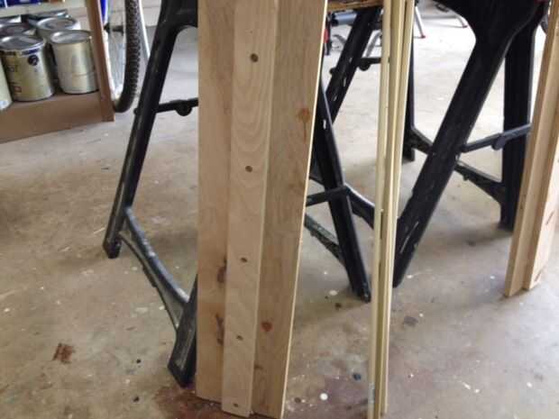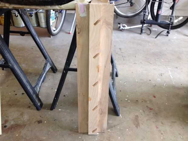 Tomé cada tira de 2.5" y pegado y había clavado hacia abajo en el centro de una tira más ancha de 7.5" de madera. La razón principal para el espaciador es facilidad de instalación, así como más fácil cargar y descargar las barras cuando esté lleno de rollos.