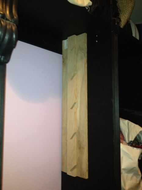 El espacio que elegimos para instalar era una sección de mi armario de esposas. Es aproximadamente 25" de ancho. Retiramos la varilla de la ropa de esa sección. Esto funciona en cualquier espacio donde hay dos paredes como dentro de un gabinete con la bandeja quitada o encima de una zona de escritorio etc..
