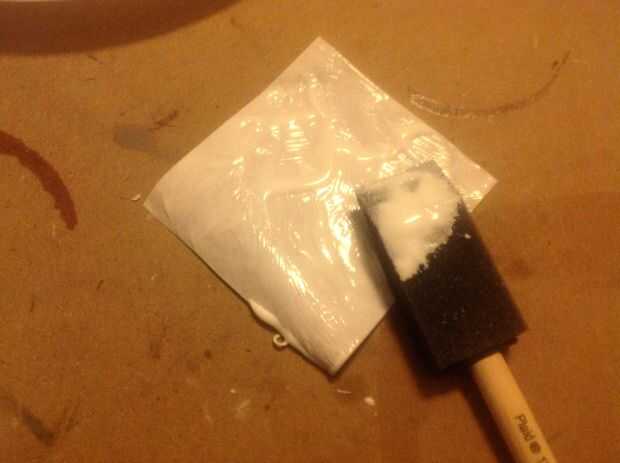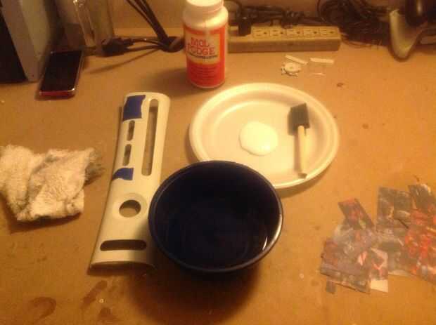 Repita este paso hasta que la placa de orificio es covered.if usas los dedos en vez del pincel esponja asegúrese de que usted limpie el seco modge podge tu mano de vez en cuando para no estropear tu work.some el hage de la voluntad de imágenes sobre la placa de la cara. Doble sobre a la espalda y el palo en van a cortarlos más adelante. Una vez que estés feliz con él llevar algunos más mod podge pone en el cepillo y poner una capa en la cosa del agujero. Déjelo secar por aprox. 2 hours.keep se elevado uso para las tapas de cans.you de pintura en aerosol no quieren adherirse a nada mientras drying.the mod podge se seca claro así que no te preocupes.