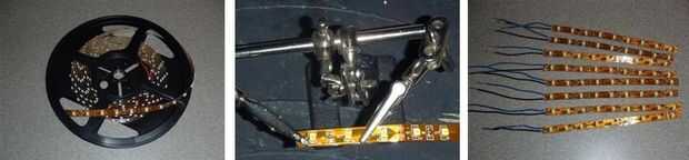 El rollo de tira de luces de LED tengo era grande, pero vino listo para ser utilizado decir cada secuencia de LEDs ya tenía una resistencia serie. El rollo es básicamente un manojo de 3 cadenas de LED en paralelo, por lo que se divide cada 3 LEDs. La resistencia serie en cada cadena necesita estar en corto circuito o el actual controlador de origen de LED no funcionará correctamente. ¿Esperar, soy lo que te sugiere alterar (o ruina, como diría mi mujer) un perfectamente buen rollo de LEDs? Por qué sí, sí soy.