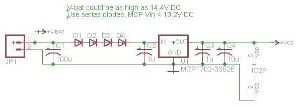 Este circuito está diseñado para funcionar con 12V DC, pero realmente podría ser procedente por cualquier cosa (incluyendo la red eléctrica) mientras se utiliza la adecuada regulación. Elegí una tensión lógica de 3, 3V en lugar del más ampliamente utilizado nivel de 5V ya que los componentes que consumen menos energía. El regulador MCP1702 viene en un 3, 3V del paquete, pero sólo puede aceptar entradas de hasta 13,2 v. Sin embargo, un cargador de baterías 12V realmente alcanzará un nivel de alrededor de 14,4 v DC, y por esta razón, puse 4 diodos de la serie antes del regulador para el voltaje de entrada no exceda este nivel. El primer condensador, C1, es ayudar a suministrar los LEDs con potencia de inmediato cuando se encienden. Los condensadores circundantes son necesarios para la estabilización de salida y voltaje regulador apropiado. Si este circuito debían ser utilizados en una casa típica usando un voltaje de CA, un transformador y rectificador circuito tendría que utilizarse para crear un DC adecuado nivel para los LEDs, así como un nivel aceptable de entrada para los 3, 3V se muestra regulador.