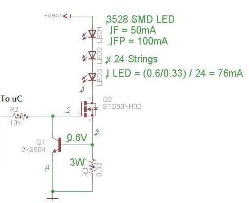 El LED es una fuente de corriente constante muy simple con un ancho de pulso modulado (PWM) de la uC para controlar el brillo del LED. El funcionamiento es bastante sencillo. Cuando un voltaje en el gate de Q2, el MOSFET se enciende, permitiendo que la corriente a pasar a través de como un interruptor de relé. El transistor utilizado determinará el nivel de voltaje necesario, pero mina enciende completamente con los 3, 3V suministrada de la uC. Corriente fluye a través de los LED y el resistor R3. Esto es donde se pone un poco interesante. Q1 también se encenderá y a hacer todo lo posible para mantener una constante base a nivel de la tensión de emisor de 0.6 v. Otros transistores pueden ubicarse en un nivel de tensión diferente. Este voltaje constante a través de R3 las fuerzas de una corriente constante a través de las resistencias. La corriente es esencialmente V-Q1, B-E / R3, o en este caso 0. 6V / 0.33ohms que equivale a 1,81 amperios. Por supuesto, esta corriente es compartida por muchas cadenas de LEDs, 24 para ser exactos, lo que significa cada LED tendrá un lleno en la corriente de alrededor 76mA. La hoja de datos de 3528 SMD LED indica que una corriente directa constante de 50mA o un pulso de corriente de 100mA es aceptable, por lo que debemos tener claro como se pulsan los LEDs.