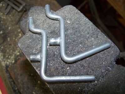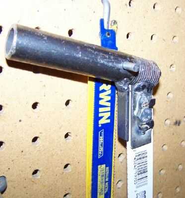 hice un mango para hojas de Sierra de calar y quiero colgar que vieron en mi pegboard.  Pero, las suspensiones comerciales tienen una curva en ellos.  Se ha cambiado el ángulo de la suspensión para que la sierra puede colgar sin que las hojas que pesca con caña hacia fuera del pegboard.  Ver la segunda foto debajo de la diferencia entre una suspensión de la fábrica (lado derecho) y cómo cambié el ángulo (lado izquierdo).