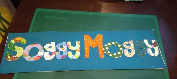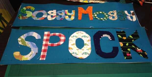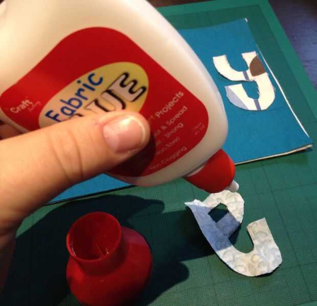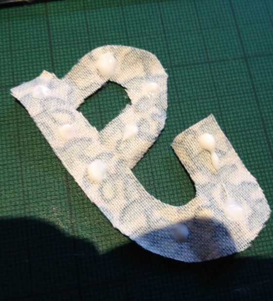 Cuando feliz con la forma de que las letras están sentados uso los óvulos pegarán para colocar en su lugar. Esto no es permanente y se lava una vez que la pieza ha sido lavada, pero tiene cosas en su lugar muy bien hasta que se les puede coser en el lugar.
