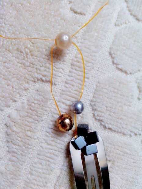 Ahora, pasar a otro grano por un extremo del hilo y cruzar ese grano con el otro extremo del hilo (tomé un grano blanco de la perla para este paso).