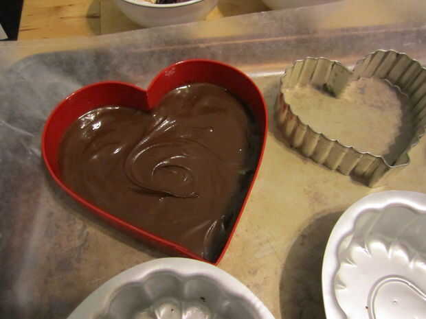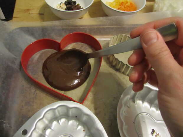 Una vez que el chocolate se haya derretido, vierta en el una cucharada de moldes a la vez, hasta que el chocolate se extiende bien y uniformemente hasta los bordes. No extender el chocolate derretido demasiado fino o se romperá al intentar quitarlo del molde. No difundir el chocolate muy espeso, o bien, como demasiado chocolate será dominar los sabores de sus ingredientes. Tuve éxito con un espesor de 3/16-inch(.5cm).
