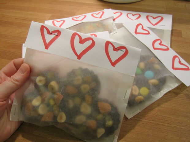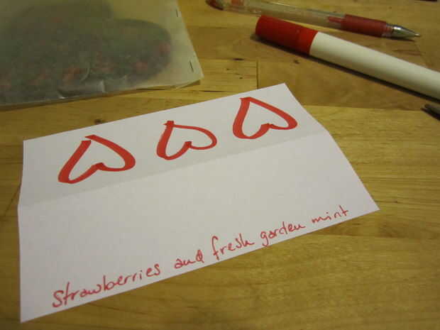 Cortar un trozo de papel blanco a la anchura de la parte superior de la envolvente, para crear una etiqueta que se pliega sobre la parte superior. Doblar la etiqueta por la mitad y decorar con el bolígrafo rojo y el marcador. Un diseño simple puede ser suficiente para decir "Te quiero". No olvide escribir los ingredientes en la etiqueta, por lo que su ser querido sabe lo que comen!