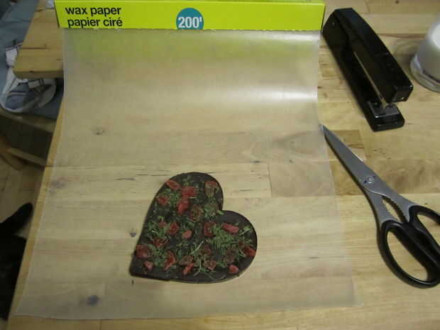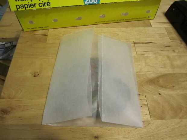 Doble los 2 lados del papel cera en hacia el centro de la envolvente. Quitar la barra de chocolate.