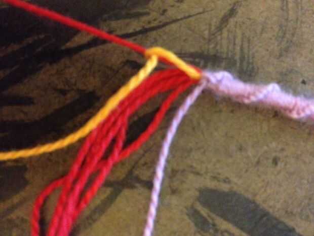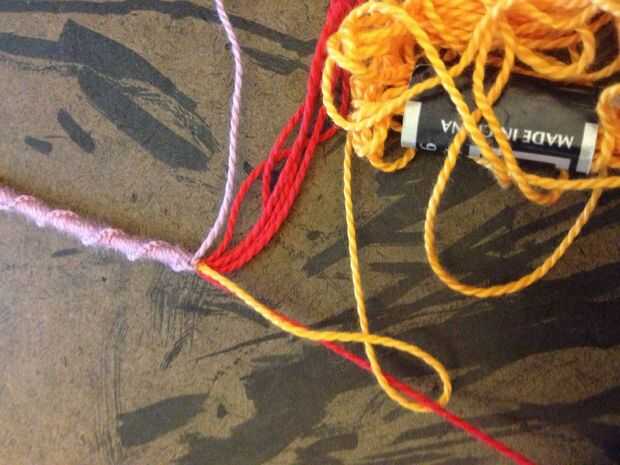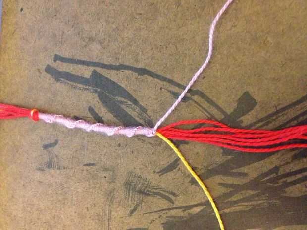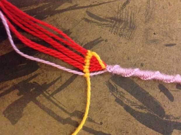 Con el único color que desea que rodean las letras a la izquierda (naranja) y el otro color solo colocada a la derecha (púrpura), un nudo hacia adelante con la cadena de naranja alrededor de la cadena a la derecha de él. Haga otro nudo hacia adelante alrededor de la misma cadena. Utilizando la cadena naranja, continuar atar dos nudos hacia adelantados en cada cadena hasta llegar al final de la fila.