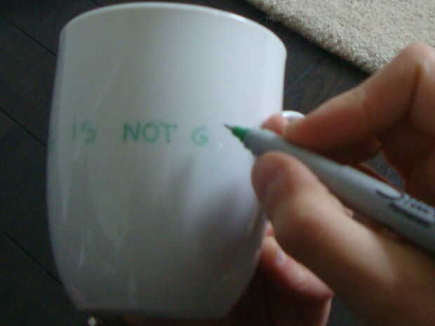 No puedo decirte cómo hacerlo. Basta con dibujar, escribir, ser un artista con su taza y sus marcadores. Puede copiar cotizaciones, o dibujar un patrón de colores... Es todo hasta usted! Pero esto es muy importante: no escribir o dibujar cualquier cosa dentro de la taza y en el borde de la taza. No queremos que conseguir enfermo por haber tragado la tinta de los marcadores. Usted puede fácilmente quitar nada de la taza frotando algo de agua sobre el área deseada.