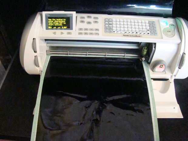 Poner el vinilo (compré un rollo de 24" de ancho por 50 yarda de largo, hace muchos años), en la almohadilla de corte.  Abrió mi expresión y lo prendia, entonces cargado la almohadilla con el vinilo en él en la máquina (presioné el botón cargar empujando la estera contra los rodillos).  Configurar la profundidad de la cuchilla 3 y la presión a 2 (estos son el ajuste óptimo para cortar el vinilo sin cortar el soporte de papel).