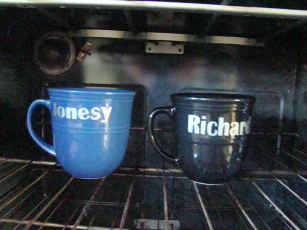 Tomar la taza seca y se coloca en una parrilla en el horno. Cerrar la puerta del horno y gire el horno a 375 ° F y ajuste el temporizador durante 40 minutos.  Cuando el temporizador se apaga, apague el temporizador y apagar el horno, dejando la taza en el horno hasta que esté completamente frío.