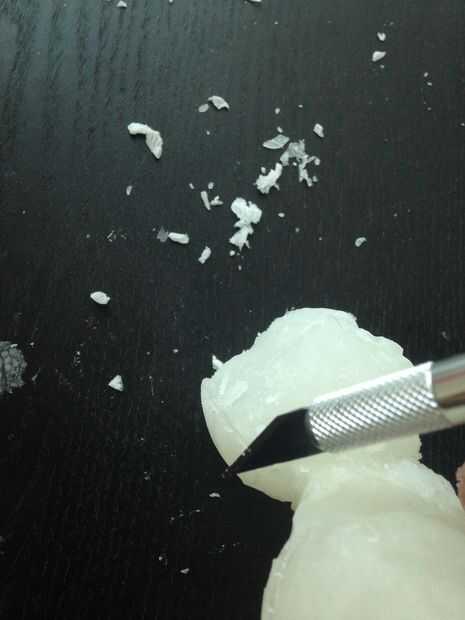 Ahora con el cuchillo corta las líneas como se muestra en la foto de arriba, éstos son causados donde se unen las dos piezas del molde. En mi caso estoy usando un cuchillo xacto.