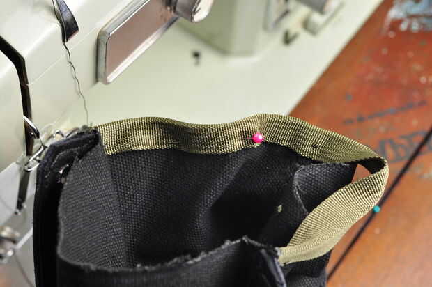 Ajuste las correas para asegurarse de que la longitud es correcta. Los bordes y el centro con puntos de sutura inmóvil zig-zag con tachuelas, y tensada para asegurarse de que no había demasiadas arrugas. Usé rosas alfileres para sujetar cosas en su lugar, de lo contrario que el material de la tela se furtivamente fuera de su doblez de la cinta mientras que usted está cosiendo, entonces tienes que ripear todos tus puntadas y volver a empezar (lecciones aprendidas de hacer este dos veces!).