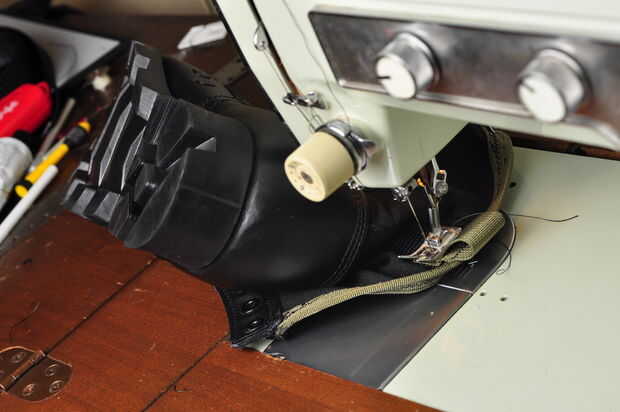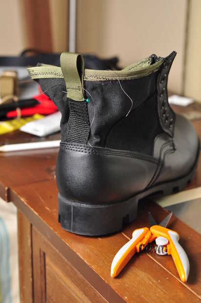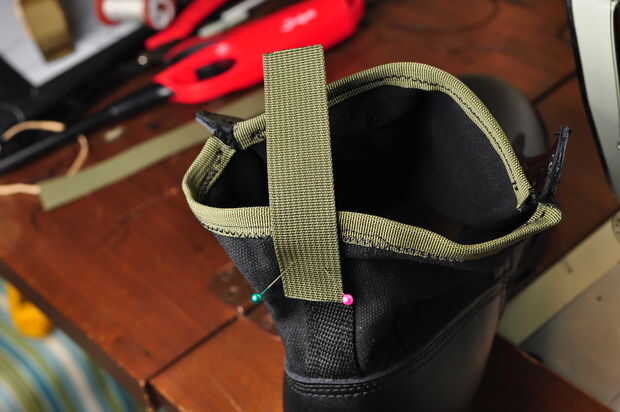 Normalmente pondría una puntada de zig-zag caja en algo como esto, pero no había manera podría dar vuelta la bota 360 grados para hacer una caja continua. Tres puntadas recta lo es!