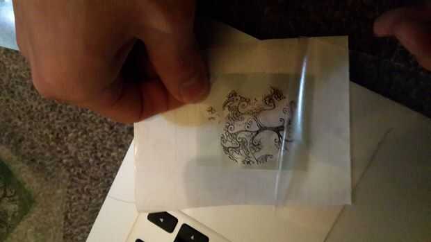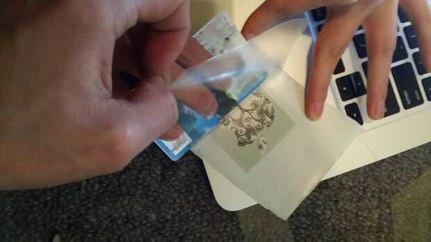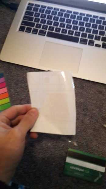 Recuerde usar una tarjeta para empujar lentamente la capa de adhesivo sobre el logo para impedir que cualquier burbuja de aire.