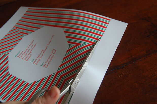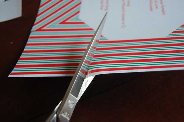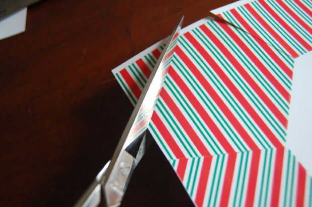 Corte líneas sólidas (en la plantilla normal) o donde el patrón de cambios en las franjas de la Navidad. En la plantilla de Navidad también verá muy finas líneas rojas como guía de corte donde el patrón no cambia. No olvides cortar la muesca a medio camino entre las dos esquinas opuestas.