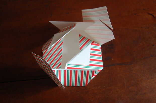 A partir de una de las esquinas con muescas, doblar todas las aletas (omitiendo la segunda esquina con muescas). Doble la esquina de su última puerta debajo de la primera aleta que dobla. Doblar las dos esquinas. No hay necesidad de les muesca ahora, porque sólo vas a abrir todo otra vez. En este caso, "desgaste" es literalmente lo que quiere evitar.